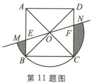 11.如图,在正方形$ABCD$中,$AC$和$BD$交于点$O$,过点$O$的直线$EF$交$AB$于点$E$($E$不与$A,B$重合),交$CD$于点$F$.以点$O$为圆心、$OC$为半径的圆交直线$EF$于点$M,N$.若$AB = 1$,则图中阴影部分的面积为(