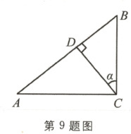 9.如图,在$ Rt\triangle ABC$中,$\angle ACB = 90^{\circ}$,$CD\perp AB$于$D$,$AC = 2\sqrt{2}$,$AB = 2\sqrt{3}$.设$\angle BCD = \alpha$,那么$\cos\alpha$的值是(