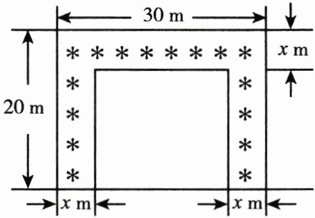 15. 某中学有一块长$30\ m$、宽$20\ m$的矩形空地,计划在这块空地上划出$\frac{1}{4}$的区域种花,小禹同学的设计方案如图所示,求花带的宽度.设花带的宽度为$x\ m$,则可列方程为().