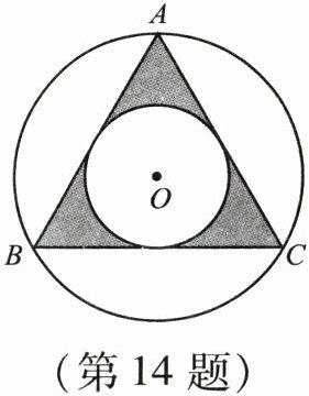 14. 如图,等边三角形内接于大$\odot O$,小$\odot O$是等边三角形的内切圆,随意向大$\odot O$内部区域抛一个小球,则小球落在阴影区域的概率为().