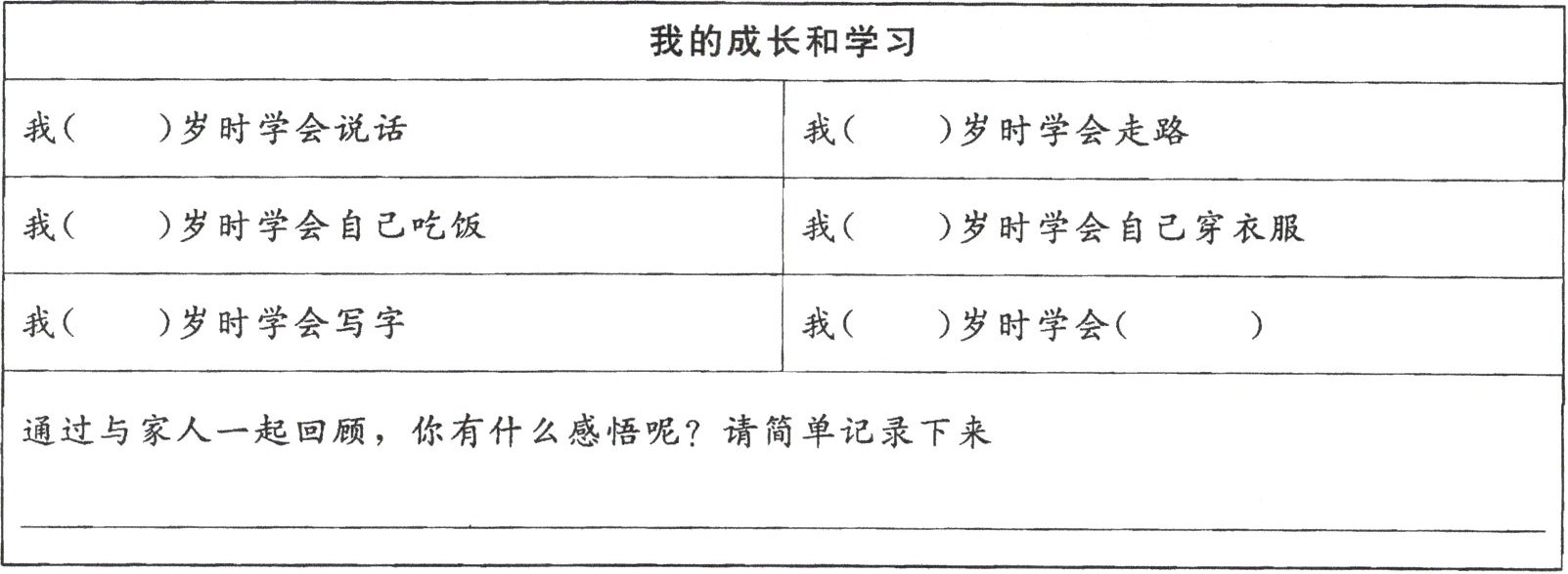 成长离不开学习,作为三年级的小学生,你学会了哪些知识或本领呢?请和家人聊一聊,填写下面的表格。