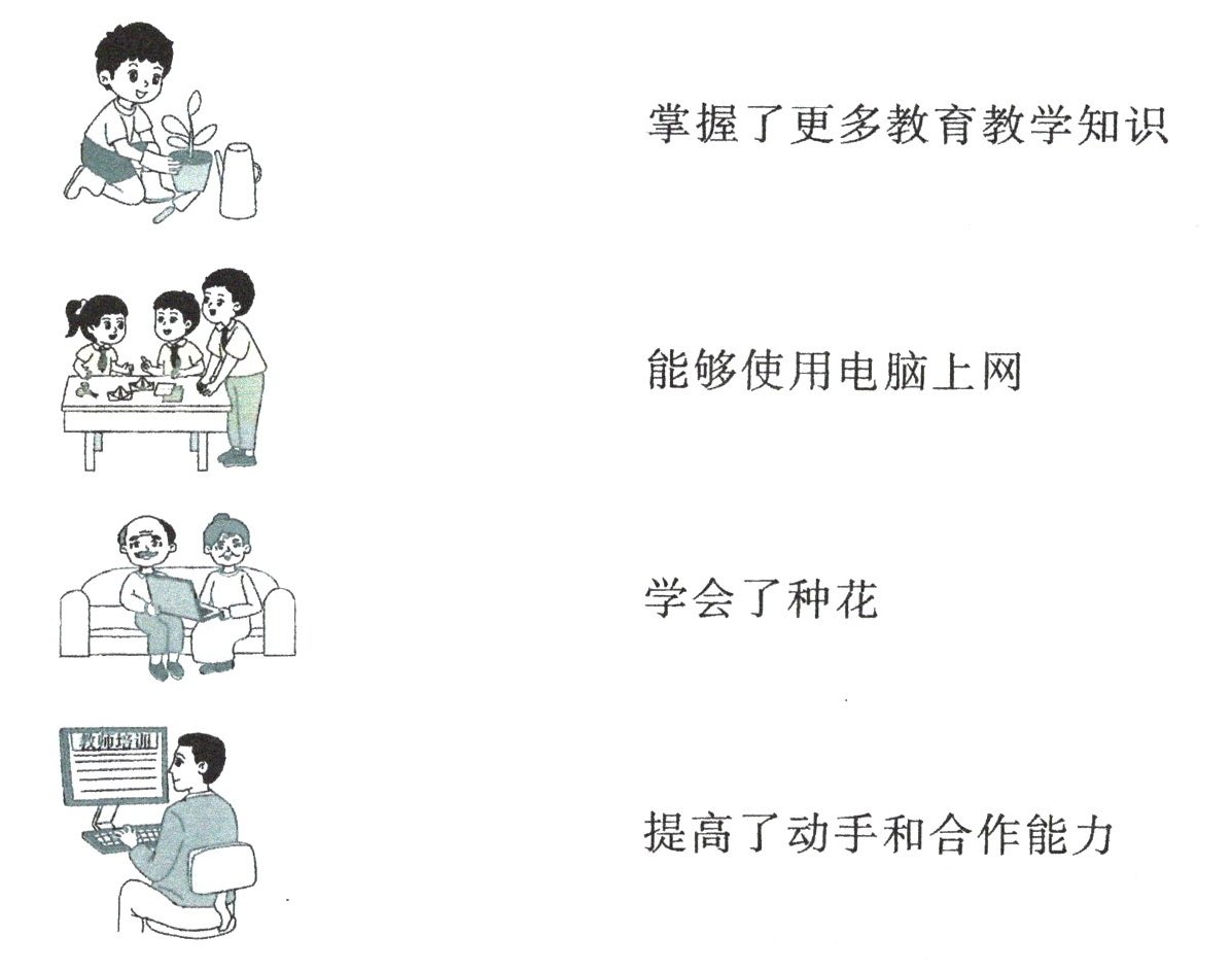 第一幅图-学会了种花;第二幅图-提高了动手和合作能力;第三幅图-能够使用电脑上网;第四幅图-掌握了更多教育教学知识