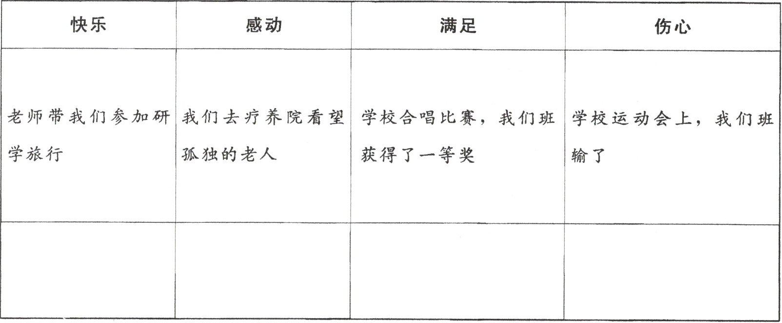 1.(提示)结合自己的班级生活实践圈出相关的活动即可。(示例)我们班开展过的活动:跳绳、大扫除、合唱、运动会、中秋班会、读书会、拔河、爱心捐款等。我参加过的活动:跳绳、大扫除、运动会、中秋班会、读书会、爱心捐款等。2.(示例)快乐:班级体操比赛获得第一 感动:同学亲手给我做了贺卡 满足:在每次卫生评比中,我们班都是第一名 伤心:在拔河比赛中,我们班输了