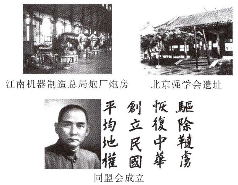 )(图中内容:江南机器制造总局炮厂炮房、北京强学会遗址、同盟会成立)