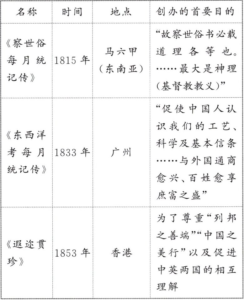 | 《察世俗每月统记传》 | 1815年 | 马六甲(东南亚) | “故察世俗书必载道理各等也。……最大是神理(基督教教义)” |