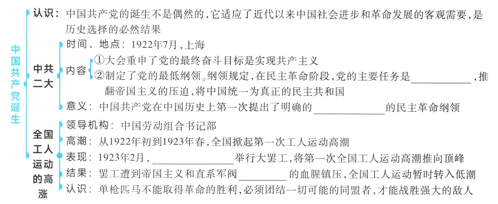 (2)地点:上海。(1 分)中心工作:领导和组织工人运动。(1 分)历史事件:京汉铁路工人大罢工。(1 分)