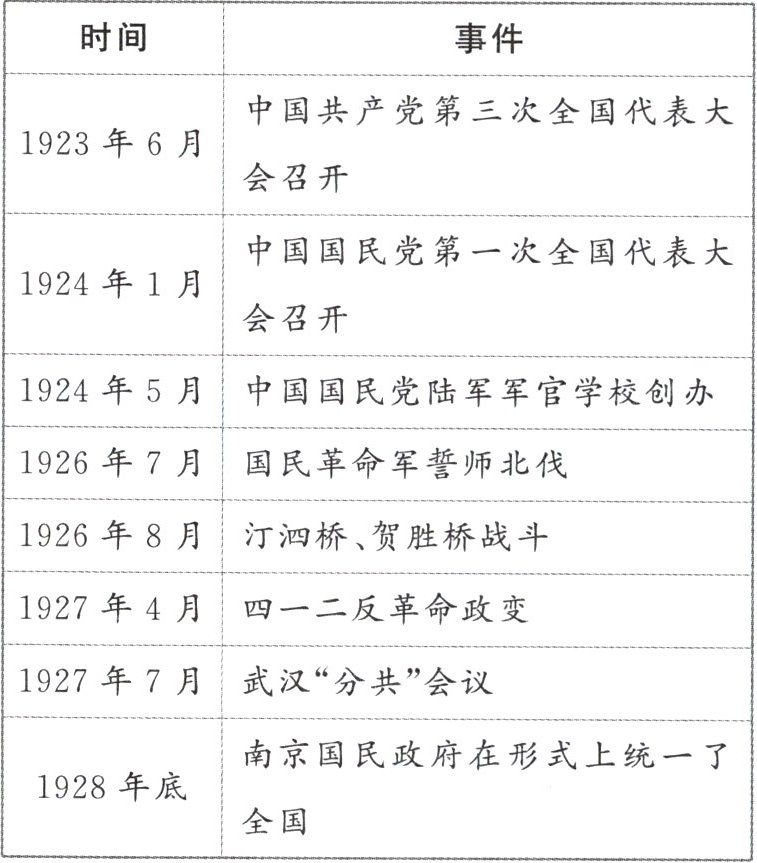 (2)(示例)选取事件:"中国国民党第一次全国代表大会召开""国民革命军誓师北伐""四一二反革命政变""武汉'分共'会议"。(2分)