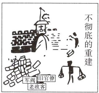 8. 漫画《不彻底的重建》(如图)创作于1927年南京国民政府成立后。画中建设城门的砖头上写着“军阀”“旧官僚”“老政客”。该漫画(