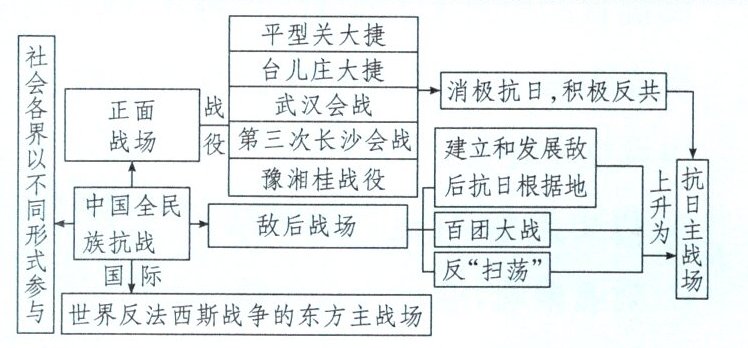 (3)①历史背景:1937年7月7日,日本发动全面侵华战争,中国民族危机空前严重,全民族抗战开始。(2分)②时代精神:天下兴亡、匹夫有责的爱国情怀;视死如归、宁死不屈的民族气节;不畏强暴、血战到底的英雄气概;百折不挠、坚忍不拔的必胜信念。(答出一点即可,2分)