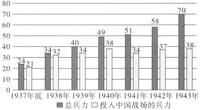 10. 下图是日本陆军总兵力以及投入中国战场兵力的统计表(单位:个师团)。数据表明(