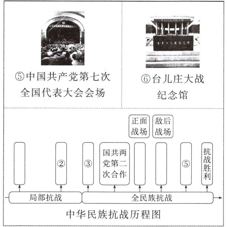 (2)结合所学知识,将材料二中的中华民族抗战历程图按时序填充完整。(填序号)(3分)