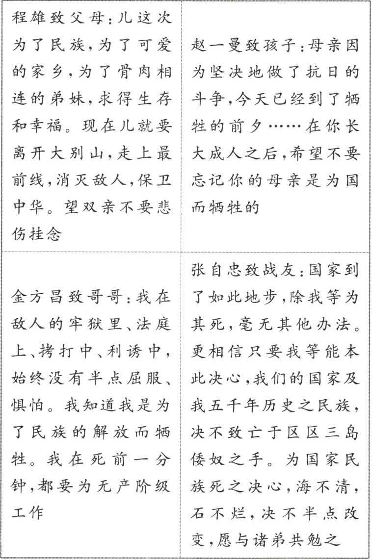 | 程雄致父母:儿这次为了民族,为了可爱的家乡,为了骨肉相连的弟妹,求得生存和幸福。现在儿就要离开大别山,走上最前线,消灭敌人,保卫中华。望双亲不要悲伤挂念 | 赵一曼致孩子:母亲因为坚决地做了抗日的斗争,今天已经到了牺牲的前夕……在你长大成人之后,希望不要忘记你的母亲是为国而牺牲的 |