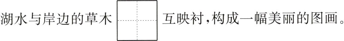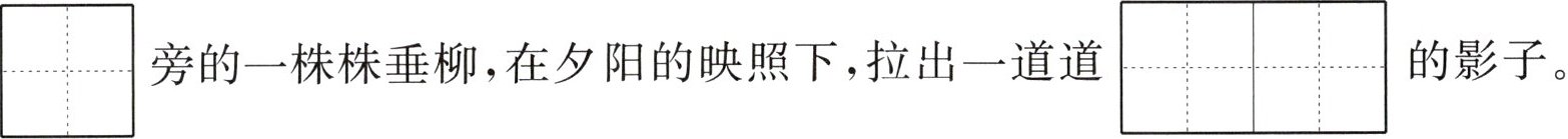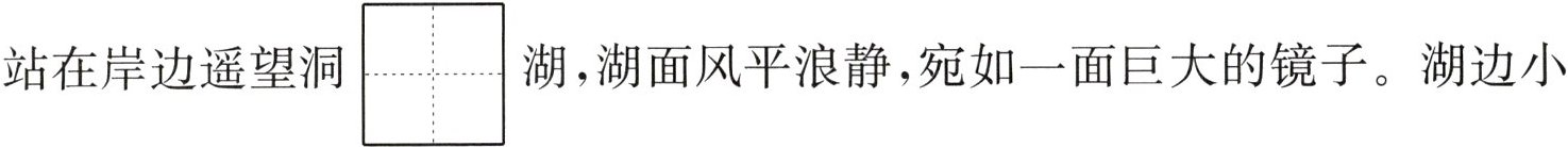 站在岸边遥望洞$\begin{array}{|c|}\hline tínɡ \\ \hline \end{array}\\ \hline $湖,湖面风平浪静,宛如一面巨大的镜子。湖边小$\begin{array}{|c|}\hline jìng \\ \hline \end{array}\\ \hline $旁的一株株垂柳,在夕阳的映照下,拉出一道道$\begin{array}{|c|c|}\hline xié & chánɡ \\ \hline & \\ \hline \end{array}\\ \hline & \\ \hline $的影子。湖水与岸边的草木$\begin{array}{|c|}\hline xiāng \\ \hline \end{array}\\ \hline $互映衬,构成一幅美丽的图画。