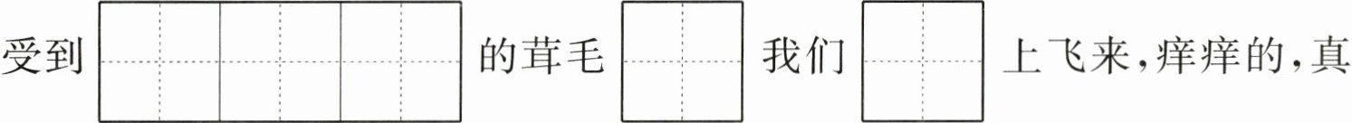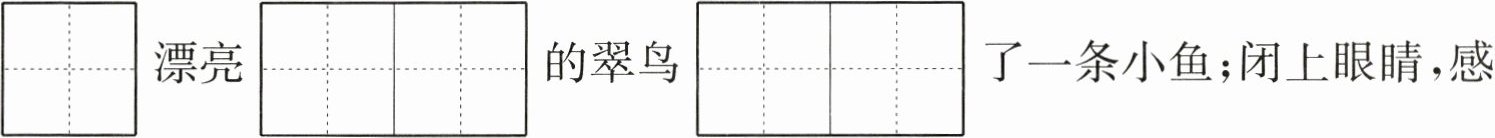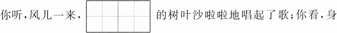 你听,风儿一来,$\begin{array}{|l|l|}\hline ān jìng \\ \hline\end{array}\\ \hline $的树叶沙啦啦地唱起了歌;你看,身$\begin{array}{|l|}\hline pī \\ \hline\end{array}\\ \hline 漂亮\begin{array}{|l|l|}\hline yǔ máo \\ \hline\end{array}\\ \hline 的翠鸟\begin{array}{|l|l|}\hline bǔ zhuō \\ \hline\end{array}\\ \hline $了一条小鱼;闭上眼睛,感受到$\begin{array}{|l|l|l|}\hline pú gōng yīng \\ \hline\end{array}\\ \hline 的茸毛\begin{array}{|l|}\hline cháo \\ \hline\end{array}\\ \hline 我们\begin{array}{|l|}\hline liǎn \\ \hline\end{array}\\ \hline $上飞来,痒痒的,真好玩!