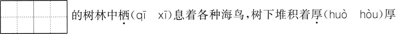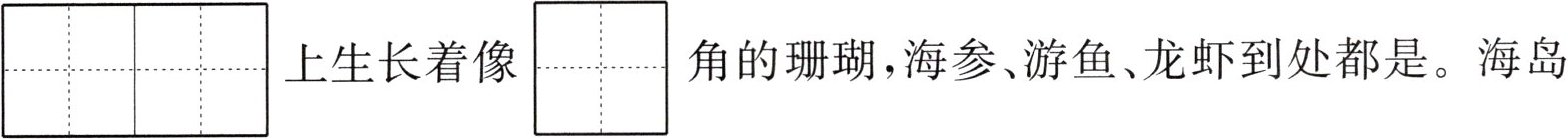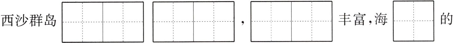 西沙群岛$\begin{array}{|c|c|}\hline fēngjǐng & \\\hline\end{array}\\\hline $$\begin{array}{|c|c|}\hline yōuměi & \\\hline\end{array}\\\hline $,$\begin{array}{|c|c|}\hline wùchǎn & \\\hline\end{array}\\\hline $丰富,海$\begin{array}{|c|}\hline dǐ \\\hline\end{array}\\\hline 的\begin{array}{|c|c|}\hline yánshí & \\\hline\end{array}\\\hline 上生长着像\begin{array}{|c|}\hline lù \\\hline\end{array}\\\hline $角的珊瑚,海参、游鱼、龙虾到处都是。海岛$\begin{array}{|c|c|}\hline màomì & \\\hline\end{array}\\\hline $的树林中