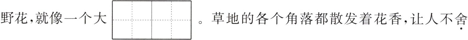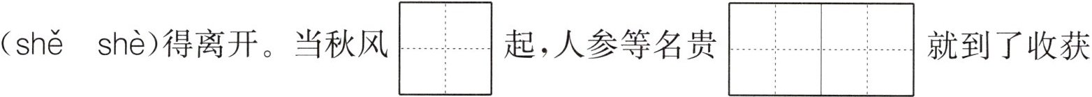 (shě shè)门前的草地上开满了各种野花,就像一个大$\begin{array}{|c|c|}\hline huā & tán \\ \hline \end{array}\\ \hline $。草地的各个角落都散发着花香,让人不舍(shě shè)得离开。当秋风$\begin{array}{|c|c|}\hline guā \\ \hline \end{array}\\ \hline $起,人参等名贵$\begin{array}{|c|c|}\hline yào & cái \\ \hline \end{array}\\ \hline $就到了收获的季节。1. 给加点字选择正确的读音,画“√”。