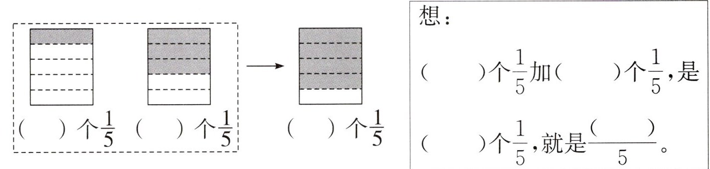 ( )个$\frac{1}{5}$加( )个$\frac{1}{5}$,是( )个$\frac{1}{5}$,就是$\frac{( )}{5}$。