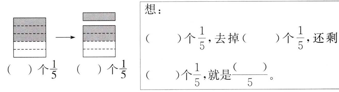 ( )个$\frac{1}{5}$,去掉( )个$\frac{1}{5}$,还剩( )个$\frac{1}{5}$,就是$\frac{( )}{5}$。