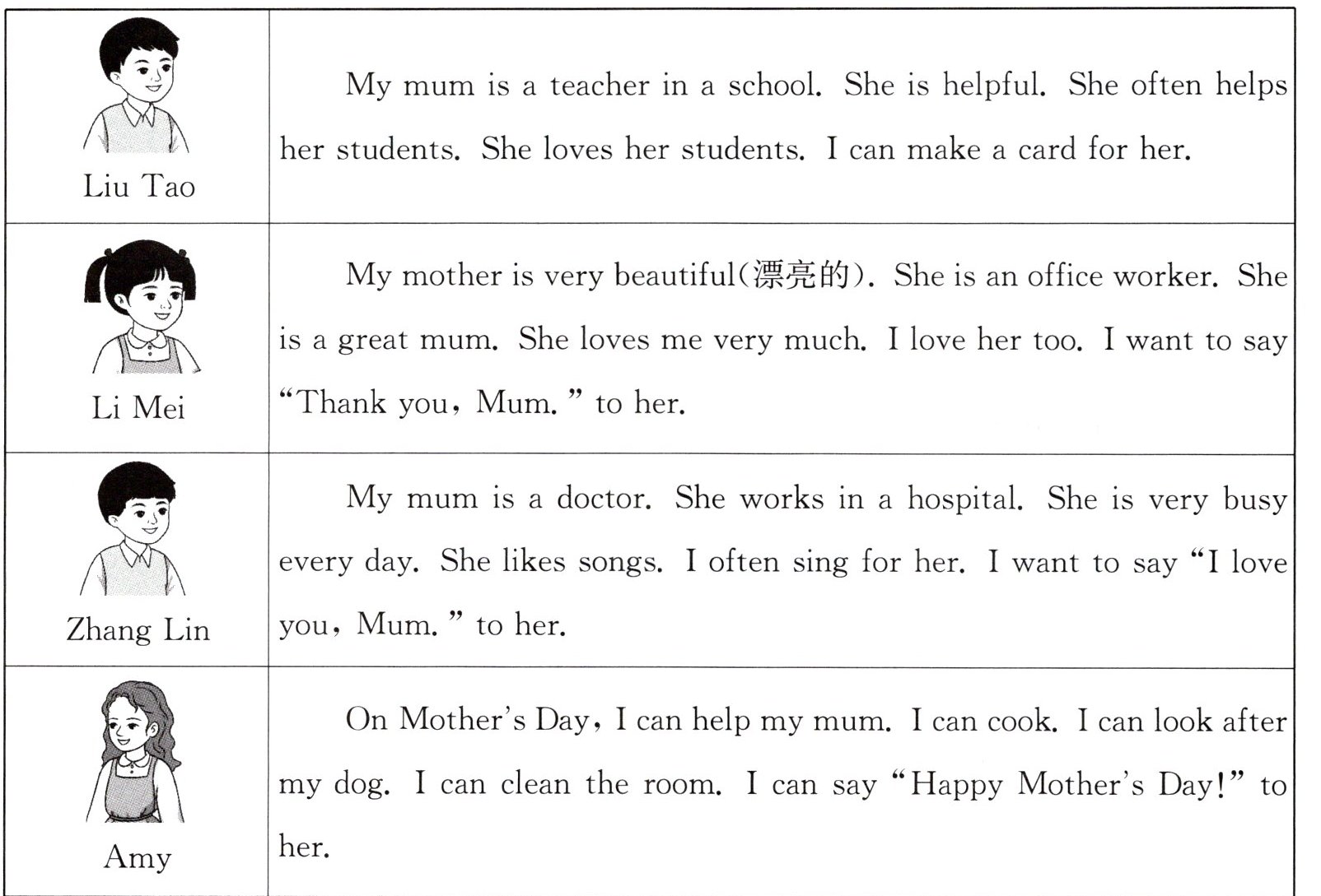 )4. Who can clean the room on Mother's Day?A. Li Mei. B. Amy. C. Zhang Lin.
