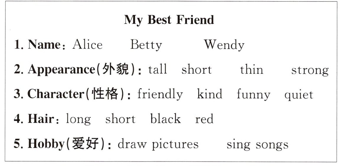 1. Wendy 2. tall; thin 3. friendly; funny 4. short; black 5. draw pictures