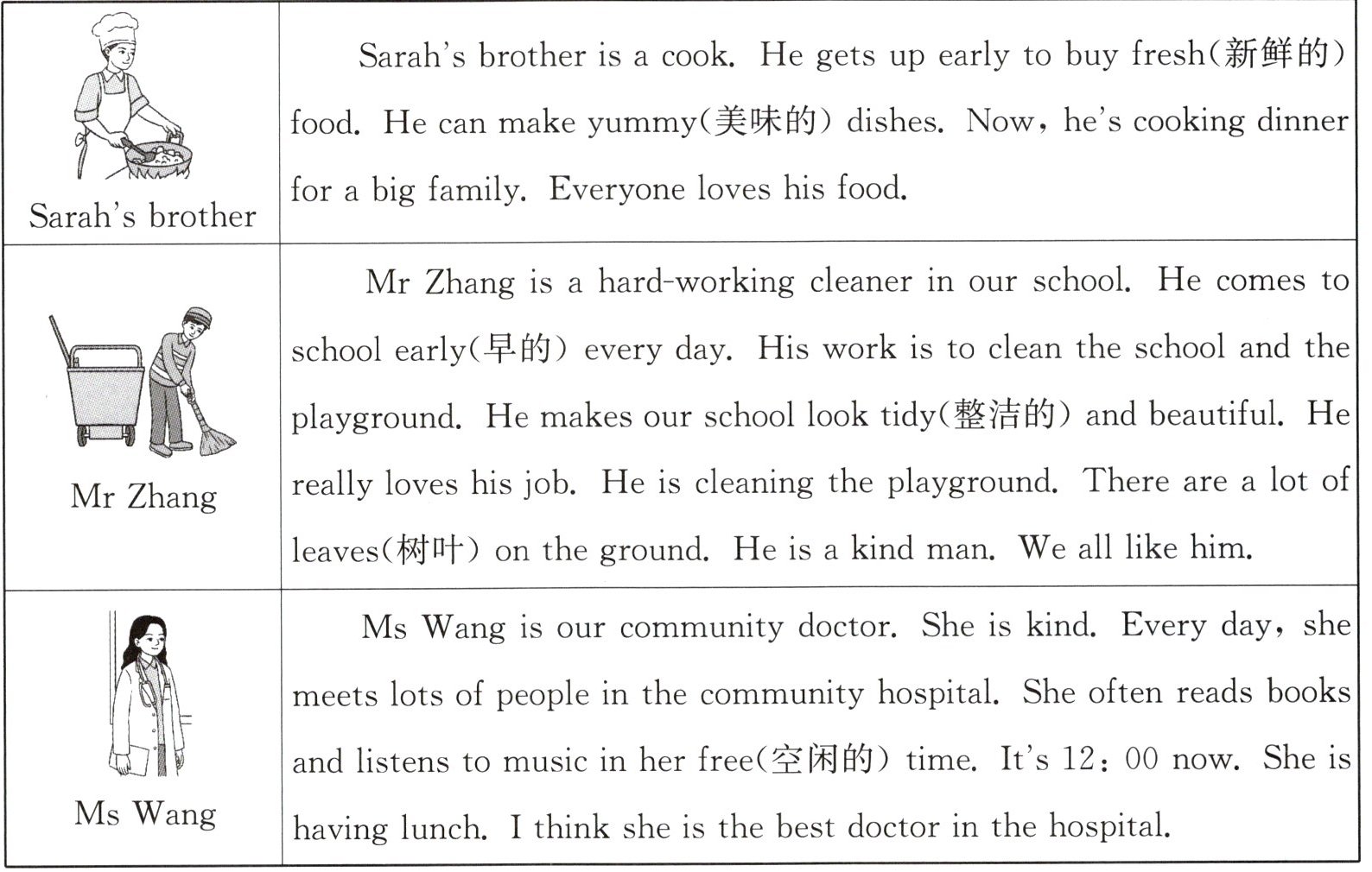 )1. What does Sarah's brother do?A. He is a cleaner. B. He is a cook. C. He is a doctor.