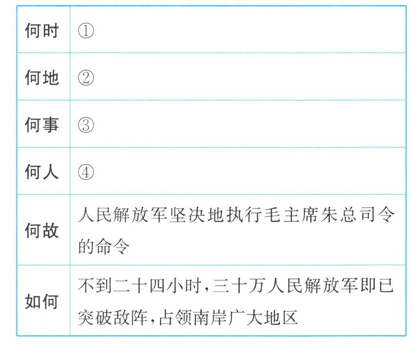 (1)①1949年4月20日午夜到21日 ②芜湖、安庆之间 ③南渡长江 ④人民解放军(约三十万人)