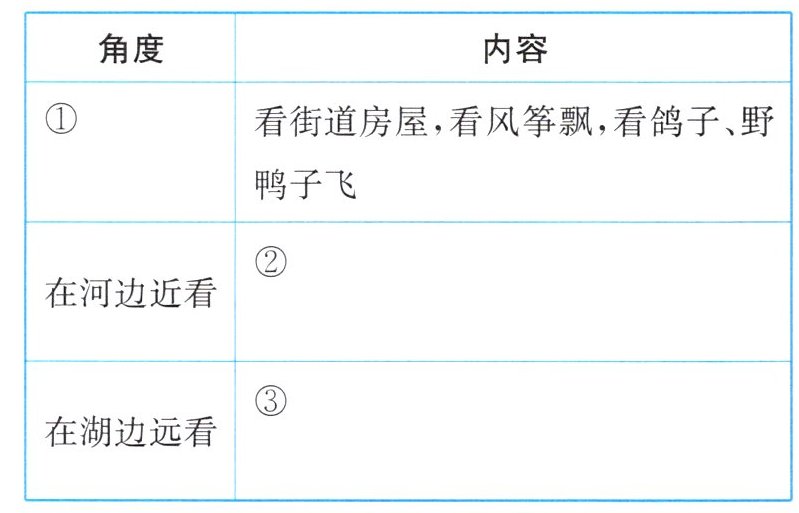 1. 文章围绕“看”写了多个场景,请根据提示完成下面的表格。