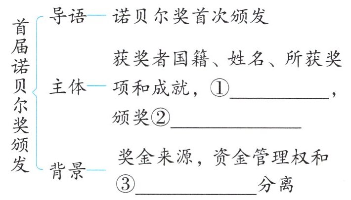 ①详细介绍首届诺贝尔奖获奖者的相关情况 ②明确颁奖机构、颁奖时间和地点 ③介绍诺贝尔奖金的来源及资金管理权与奖项评议权分离的制度