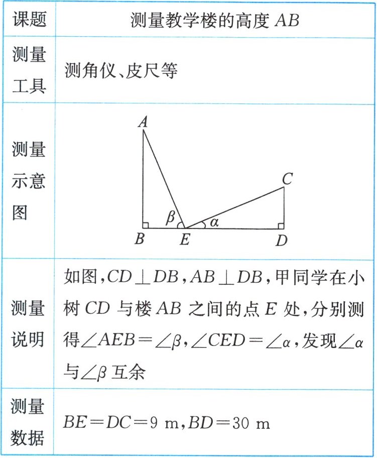 |测量说明|如图,$CD\perp DB$,$AB\perp DB$,甲同学在小树$CD与楼AB之间的点E$处,分别测得$\angle AEB= \angle\beta$,$\angle CED= \angle\alpha$,发现$\angle\alpha与\angle\beta$互余|