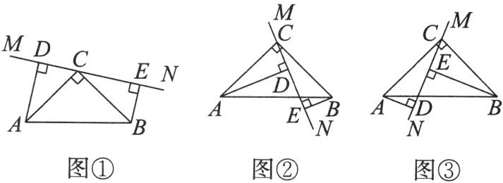 (1)当直线$MN绕点C$旋转到图①的位置时,求证:①$\triangle ADC\cong\triangle CEB$;②$DE= AD+BE$。