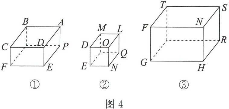 (3) 如图3,该几何体由3个大小不同的长方体(如图4)组成,其中在长方体①中,$BC = a$,$AB = a - b$,$CF = b$。在长方体②中,$ML = DE = b$,$MD = a - b$。在长方体③中,$GH = HR = a$,$HN = a - b$。用不同的方法表示图3中几何体的体积,可以得到的恒等式(将一个多项式因式分解)为