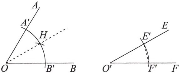 4. 如图,已知$\angle AOB与\angle EO'F$($\angle AOB>\angle EO'F$),分别以点$O$,$O'$为圆心,以同样长为半径作弧,分别交$OA$,$OB于点A'$,$B'$,交$O'E$,$O'F于点E'$,$F'$。以点$B'$为圆心,以$E'F'$为半径作弧,在$\angle AOB的内部交弧A'B'于点H$。下列结论正确的是( )