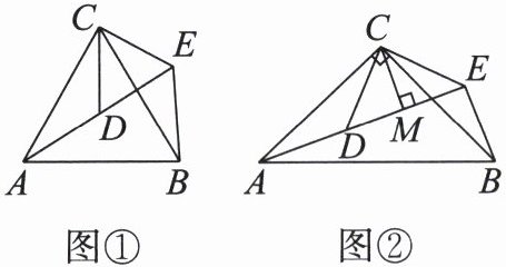如图②,△ACB 和△DCE 均为等腰三角形,∠ACB= ∠DCE= 90°,点 A,D,E 在同一直线上,CM 为△DCE 中 DE 边上的高,连接 BE。请判断∠AEB 的度数及线段 CM,AE,BE 之间的数量关系,并说明理由。
