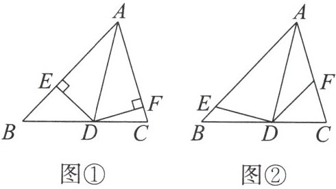 (1)若$\angle AED+\angle AFD= 180^{\circ}$(如图②),则$DE与DF$是否仍相等?若仍相等,请证明;否则请举出反例。