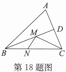 18. 如图,在 $ \triangle ABC $ 中,$ BA = BC $,$ BD $ 平分 $ \angle ABC $,交 $ AC $ 于点 $ D $,点 $ M $,$ N $ 分别为 $ BD $,$ BC $ 上的动点,若 $ BC = 4 $,$ \triangle ABC $ 的面积为 $ 6 $,则 $ CM + MN $ 的最小值为______。