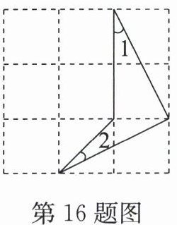 16. 如图,已知方格纸中有 9 个相同的小正方形,则 $ \angle 1 + \angle 2 $ 的度数为______ $^{\circ} $。