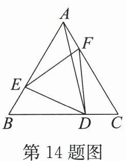14. 如图,在 $ \triangle ABC $ 中,$ AB = AC $,$ D $ 是 $ BC $ 上的一点,在 $ AB $,$ AC $ 上分别截取 $ BE = CD $,$ CF = BD $,连接 $ DE $,$ DF $,$ EF $,$ AD $。有下列结论:① $ \angle EDF = 90^{\circ} - \frac{1}{2} \angle BAC $;② $ \angle EDF = \angle B $;③ $ AD \perp BC $;④ $ \angle DEF = \angle DFE $。其中正确结论的序号是( )
