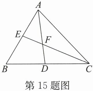 15. 如图,在 $ \triangle ABC $ 中,$ \angle ABC = 60^{\circ} $,$ AD $ 平分 $ \angle BAC $ 交 $ BC $ 于点 $ D $,$ CE $ 平分 $ \angle ACB $ 交 $ AB $ 于点 $ E $,$ AD $,$ CE $ 交于点 $ F $。有下列说法:① $ \angle AFC = 120^{\circ} $;② $ S_{\triangle ABD} = S_{\triangle ADC} $;③若 $ AB = 2AE $,则 $ CE \perp AB $;④ $ CD + AE = AC $;⑤ $ S_{\triangle AEF} : S_{\triangle FDC} = AF : FC $。其中说法正确的序号是( )
