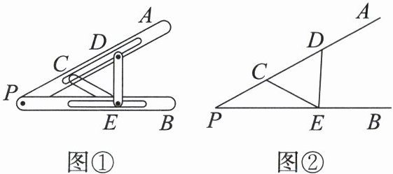 13. “三等分角”是古希腊三大几何问题之一,借助如图①所示的三等分角仪可以三等分角。这个三等分角仪的示意图如图②所示,有公共端点 $ P $ 的两条线段 $ PA $,$ PB $ 可以绕点 $ P $ 转动,点 $ C $ 固定,点 $ D $,$ E $ 在槽中可以滑动,且 $ CE = DE = CP $。若 $ \angle DEB = 87^{\circ} $,则 $ \angle P $ 的度数为( )