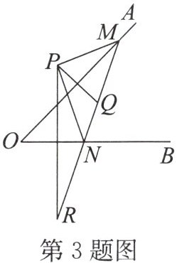 3. 如图,点$P是\angle AOB$外的一点,点$M$,$N分别是\angle AOB$两边上的点,点$P关于OA的对称点Q恰好落在线段MN$上,点$P关于OB的对称点R落在MN$的延长线上. 若$PM = 2.5\mathrm{cm}$,$PN = 3\mathrm{cm}$,$MN = 4\mathrm{cm}$,则线段$QR$的长为( )