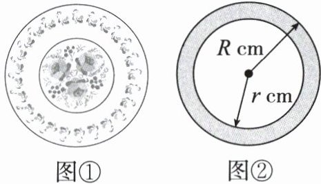22. (6分)某个圆形盘子如图①所示,其外圆半径是$R$ cm,内圆半径是$r$ cm.现在要给盘子环形部分上釉(图②阴影部分),如果$R= 10.25$,$r= 8.25$,请求出阴影部分的面积.(结果保留$\pi$)
