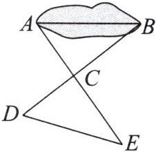 (2)在平地上取一个可以直接到达点A,B 的点C,在射线AC上取一点D,使CD=CA,在射线BC上取一点E,使CE=CB.这时测出DE的长为a m,则AB的长就是a m.