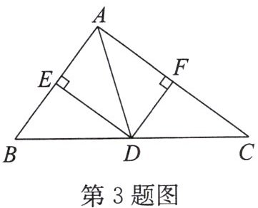 3. 如图,在 $ \triangle ABC $ 中,$ AD $ 为中线,$ DE $ 和 $ DF $ 分别为 $ \triangle ADB $ 和 $ \triangle ADC $ 的高. 若 $ AB = 3 $,$ AC = 4 $,$ DF = 1.5 $,则 $ DE = $______.