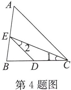 4. 如图,在 $ \triangle ABC $ 中,$ CE $ 平分 $ \angle ACB $,$ \angle 1 = \angle 2 $,若 $ \angle ACE = 23^{\circ} $,则 $ \angle EDC $ 的度数为______.