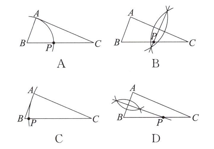 1. 如图,已知 $ \triangle ABC $($ AC < BC $),用尺规在 $ BC $ 上确定一点 $ P $,使 $ PA + PC = BC $,则符合要求的作图痕迹是(