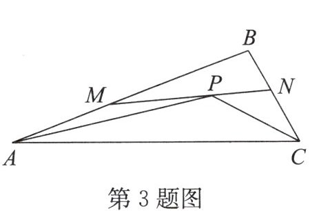 3. 如图,$ P $ 为 $ \triangle ABC $ 内一点,过点 $ P $ 的线段 $ MN $ 分别交 $ AB $,$ BC $ 于点 $ M $,$ N $,且 $ M $,$ N $ 分别在 $ PA $,$ PC $ 的垂直平分线上。若 $ AB + BC = 20 $,则 $ \triangle BMN $ 的周长是(