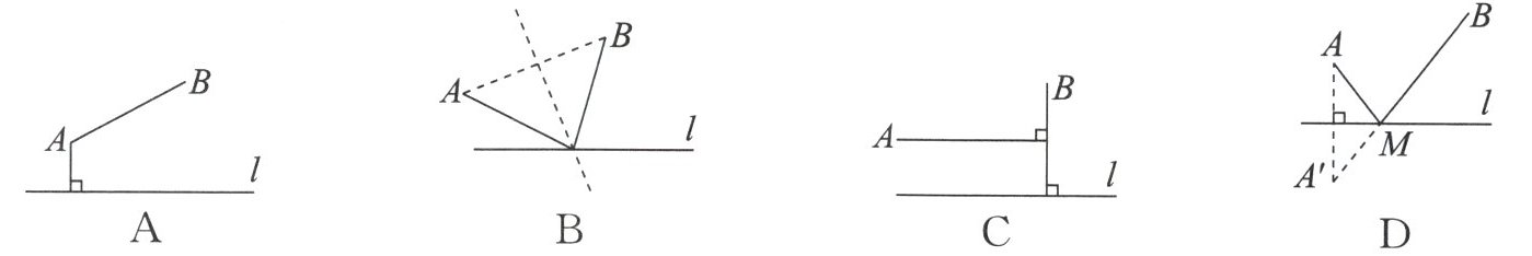 1. 如图,直线 $ l $ 表示一条河,$ A $,$ B $ 表示两个新农村定居点,欲在 $ l $ 上的某点处修建一个水泵站,由水泵站直接向 $ A $,$ B $ 两定居点供水,现有如下四种管道铺设方案,图中实线表示铺设的供水管道,则铺设管道最短的方案是(