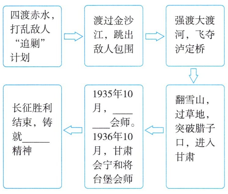 (2) 初期困境:蒋介石调集兵力对红军实行围追堵截。红军拼死冲杀,渡过湘江,但损失惨重,只剩下3万多人。