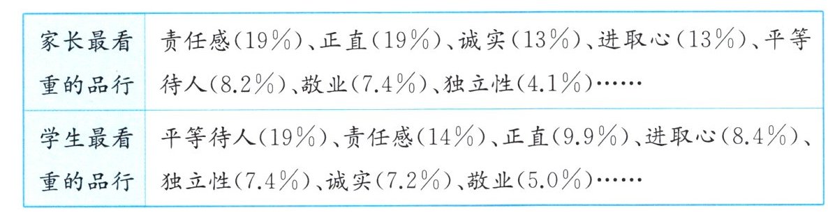 下表是关于家长和学生心目中“未来社会最应该倡导的品行”的调查,调查结果如下。