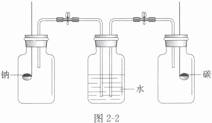 6. 将足量的钠和碳点燃并分别置于图2 - 2所示的两个盛满氧气的集气瓶中,燃烧完毕并冷却至室温后,打开装置中的两个弹簧夹,这时可观察到(